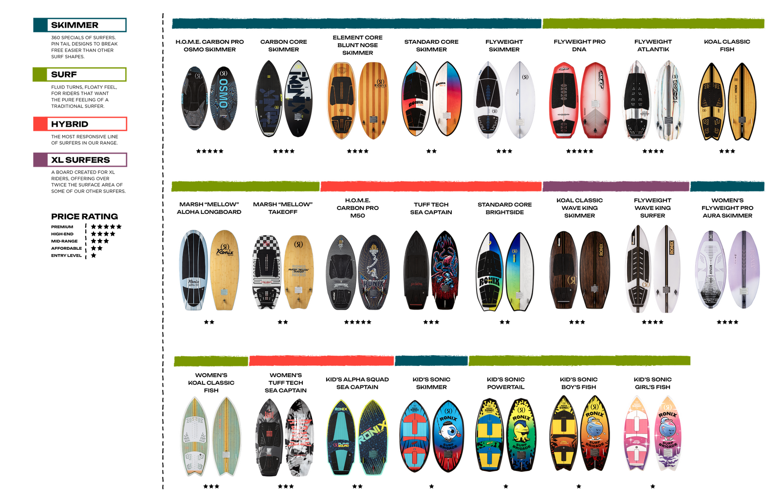 All our boards are built with the first in class materials that won’t break down over time. But three series put even more emphasis on the ooops factor. Tuff Tech. - A durable lightweight and more affordable option with a protective laminate that breaks up the water for less resistance. Packed down to a grom series - with an even lighter version - Sonic Core.