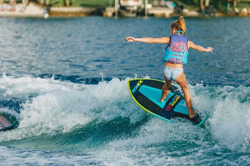 A fast, responsive style of board where the rider’s position is centered with a more balanced body. These sharp rail, thin profiled boards react quicker for people that don’t have a lot of time to waste. Preferred by surfers that like to have more feel with their board itself – and not just on fins. They can break free easier for 360’s on the water or shuvits off it. A more forgiving style of board when riding behind a steep wake because you typically ride this style of board at a shorter length (making it less likely to dunk the nose). Because of how speedy these models are – you can get away with a shorter, lightweight length.