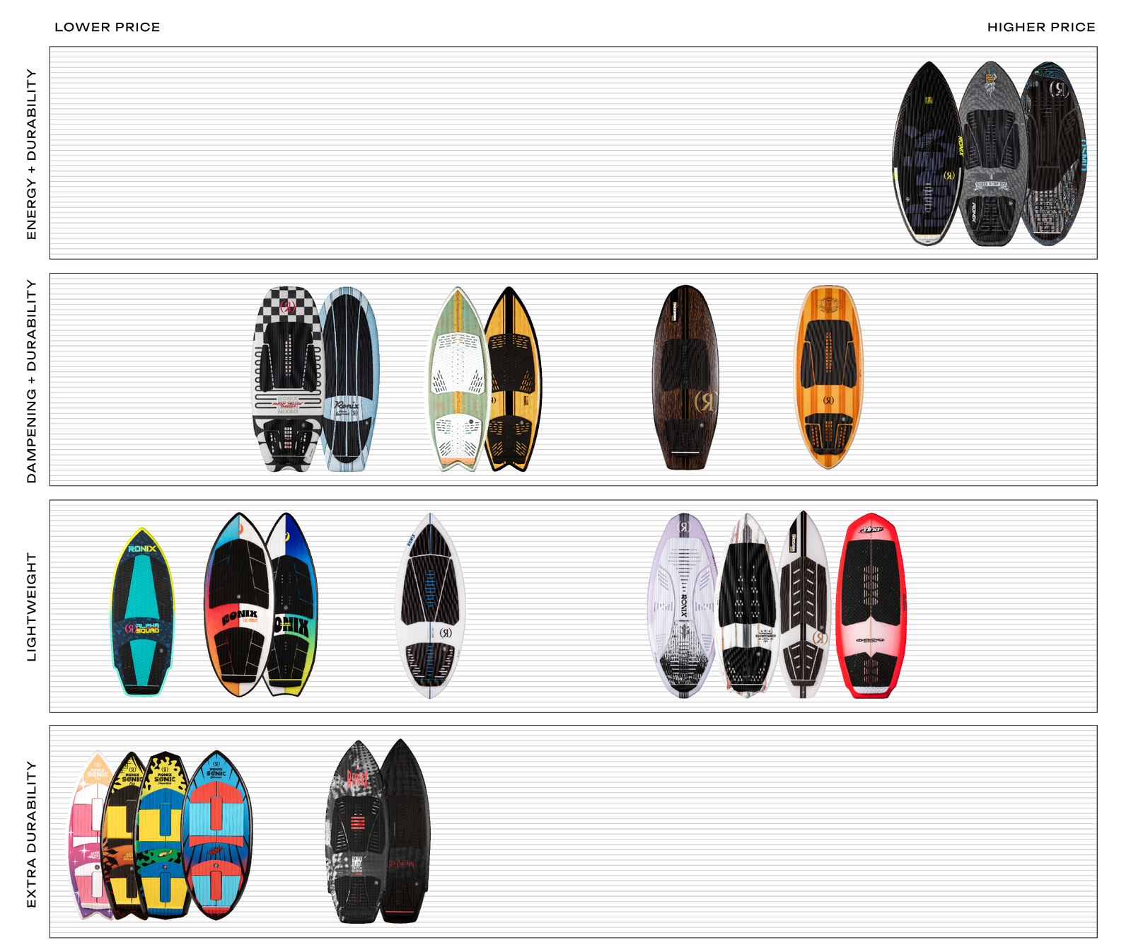 Why so many surf constructions? All of our surfers can be put into 1 of 4 categories in varying price points. Those that prioritize lightweight, extra energy, extra dampening and of course durability – or those that want a combination of 2 of them.