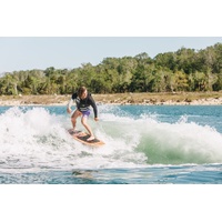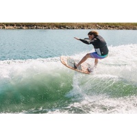 A fast, responsive style of board where the rider’s position is centered with a more balanced body. These sharp rail, thin profiled boards react quicker for people that don’t have a lot of time to waste. Preferred by surfers that like to have more feel with their board itself – and not just on fins. They can break free easier for 360’s on the water or shuvits off it. A more forgiving style of board when riding behind a steep wake because you typically ride this style of board at a shorter length (making it less likely to dunk the nose). Because of how speedy these models are – you can get away with a shorter, lightweight length.