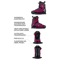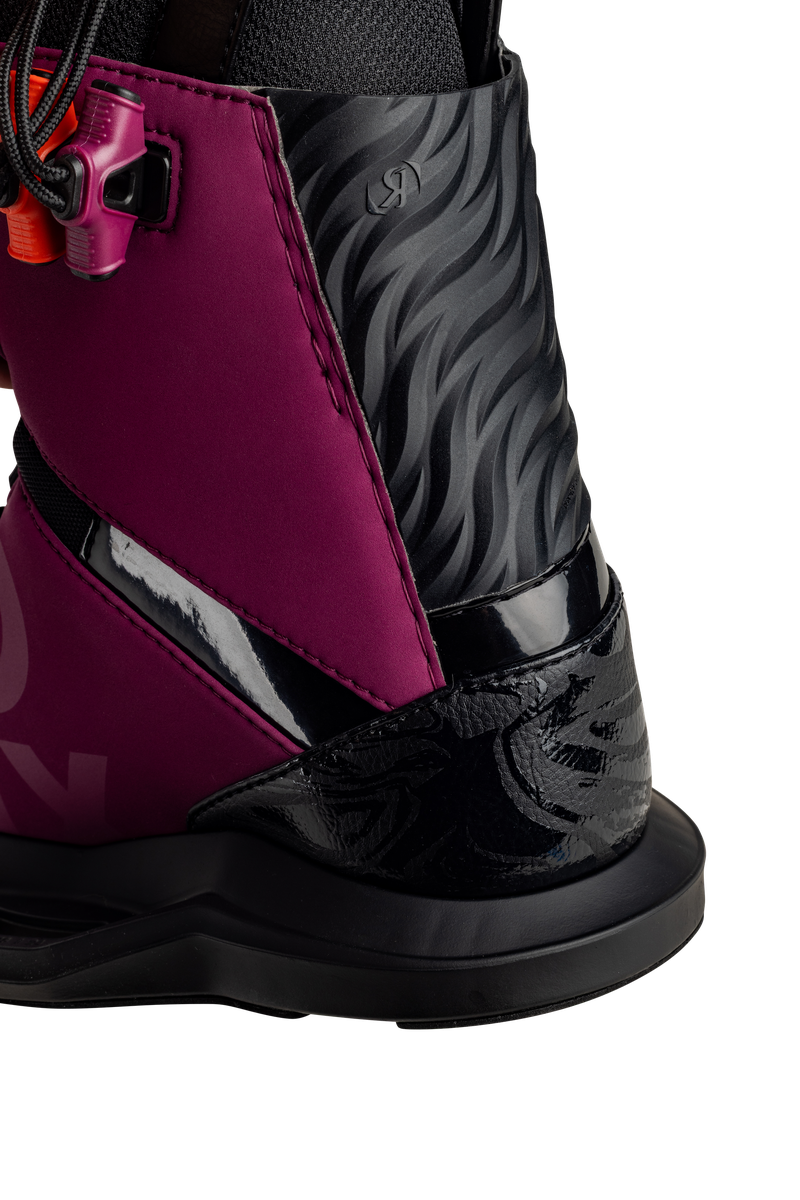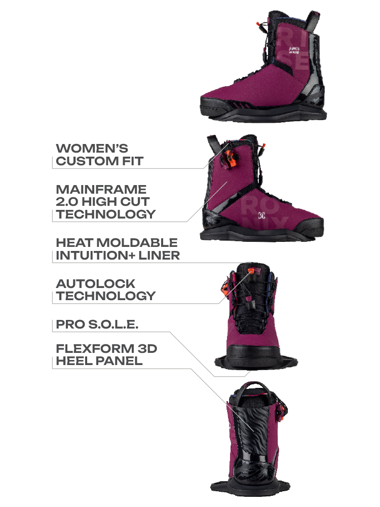 The Rise Boot is designed specifically for lady shredders. It features our proprietary Intuition+ heat moldable liner for the best fit and performance in women’s wake. We recognize that a woman’s foot has different proportions; to create the perfect fit, we use softer foam and offer a lower cut better suited for their needs. With the all-new Mainframe 2.0 High Cut skeleton, and the FlexForm 3D heel panel, every subtle movement can be efficiently transferred from your feet to the board. Take a ride on the Rise, you’ll thank us later.